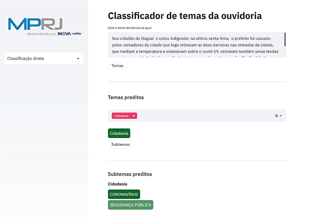 A equipe do Laboratório desenvolveu protótipo de algoritmo que lê as denúncias e indica temas e subtemas relacionados, com base no histórico de manifestações similares. Apesar de haver margem para melhoria, o protótipo alcançou uma taxa de acerto de 95% na métrica utilizada para medir seu resultado (recall).