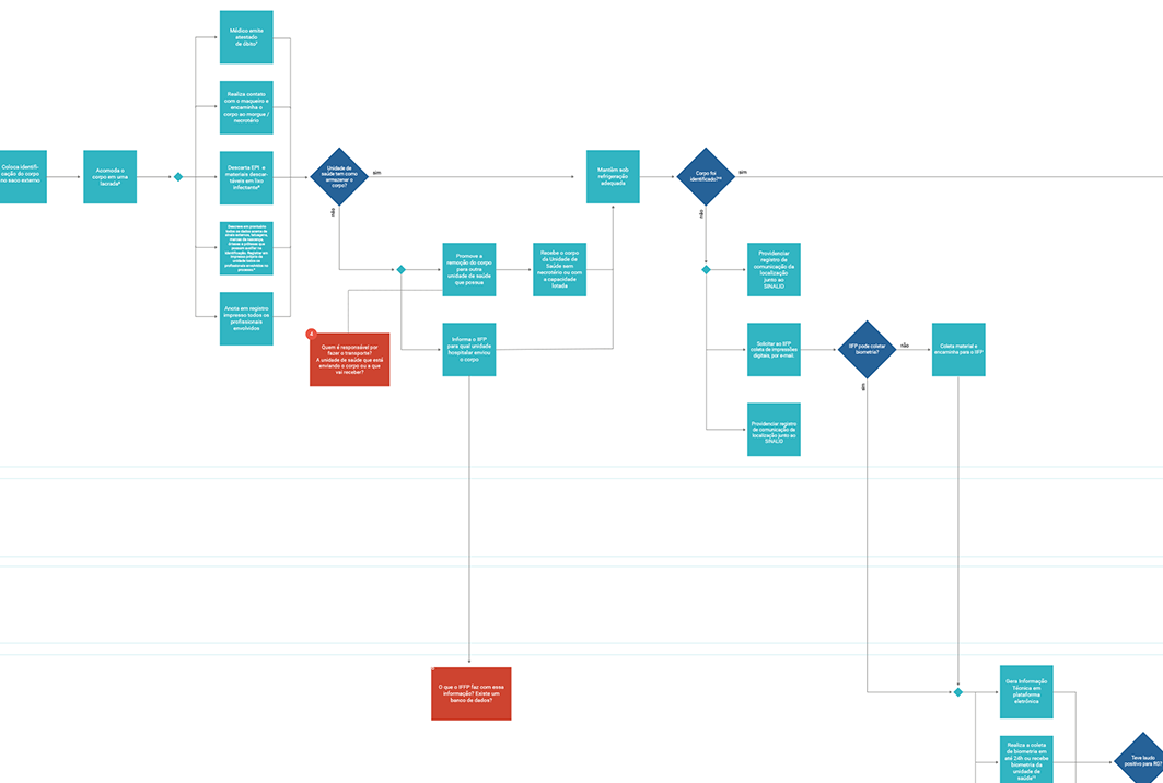 A FTCOVID-19/MPRJ definiu como um de seus temas estratégicos a fiscalização dos serviços públicos que tratam de óbitos e pessoas desaparecidas. Para o exercício dessa fiscalização, os promotores de justiça atuantes na Força-Tarefa necessitavam de uma visualização mais clara e objetiva da extensa cadeia de responsabilidades e ações relacionadas ao tema, assim como dos instrumentos jurídicos que definiam cada responsabilidade.