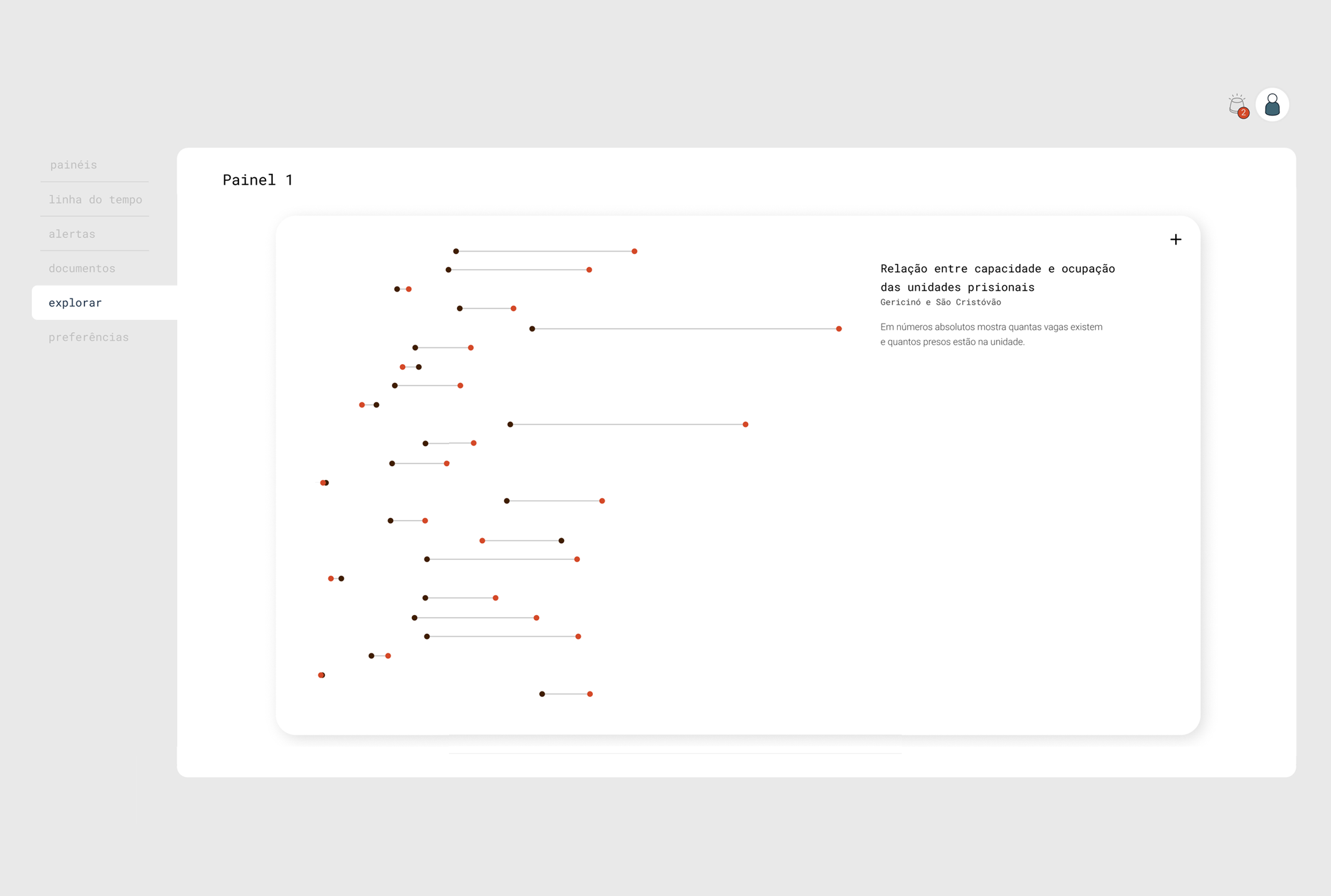 Dentre os seis temas levantados como mais relevantes pela Promotoria responsável pelo sistema prisional, o Laboratório selecionou quatro para começar a exploração e visualização de dados: lotação, fornecimento de água, alimentação e assistência material (cobrindo itens de higiene pessoal e rouparia).