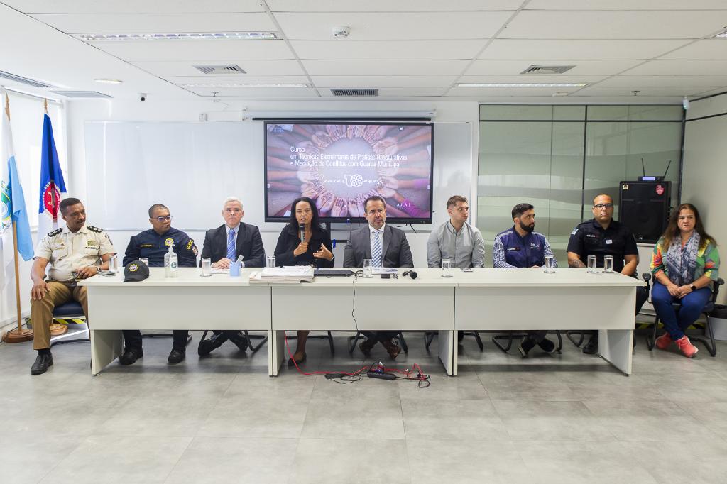 O Instituto de Educação Roberto Bernardes Barroso do Ministério Público do Estado do Rio de Janeiro (IERBB/MPRJ) encerrou, nesta sexta-feira (26/07), o curso "Técnicas Elementares de Práticas Restaurativas e Mediação de Conflitos". O programa, destinado à capacitação de agentes das Guardas Municipais do Rio de Janeiro, São Gonçalo e Tanguá, teve sua cerimônia de encerramento e última aula realizadas no mesmo dia. A programação começou com uma palestra do Grupamento de Ronda Escolar (GRE), que abordou a legalidade no contexto escolar, especialmente em relação a grupos minoritários e a crianças e adolescentes. Em seguida, foi realizada a solenidade de encerramento.