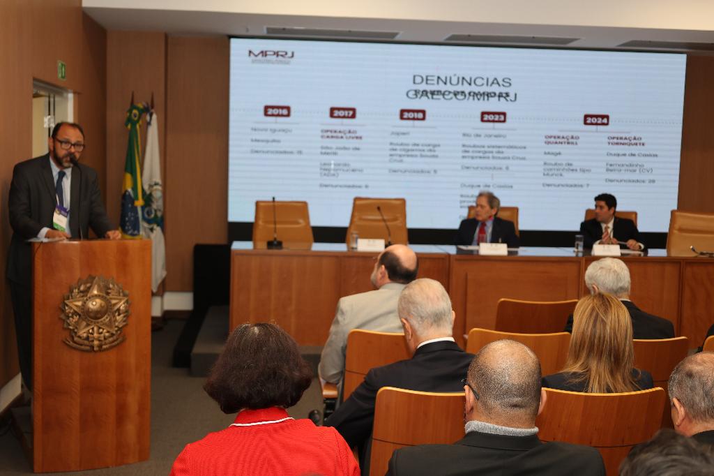 Já o promotor Pedro Simão, um dos idealizadores do simpósio, apresentou a atuação do GAECO/MPRJ no enfrentamento ao crime organizado, detalhando objetivos, estrutura operacional e áreas de foco. Também trouxe estatísticas sobre o roubo de cargas no estado do Rio de Janeiro, discutindo estratégias de prevenção adotadas tanto pelo setor público quanto pelo setor privado.