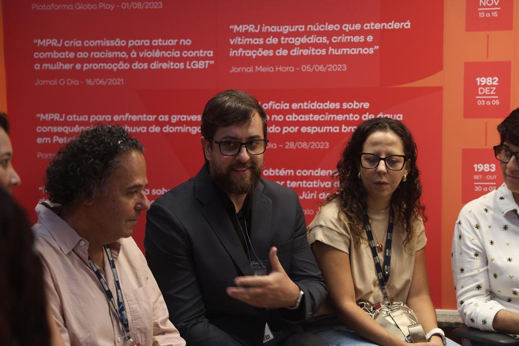 O psicólogo Gustavo Brito e a assistente social Giulia de Castro comentaram suas atribuições no NAV/MPRJ, esclarecendo as dúvidas dos estudantes e explicando como as duas áreas auxiliam o trabalho desenvolvido pelo MPRJ. Além deles, estiveram presentes as residentes técnicas Larianne Vaz e Aline Ribeiro e as estagiárias de psicologia Adrielle Máximo e Quézia Wanny.