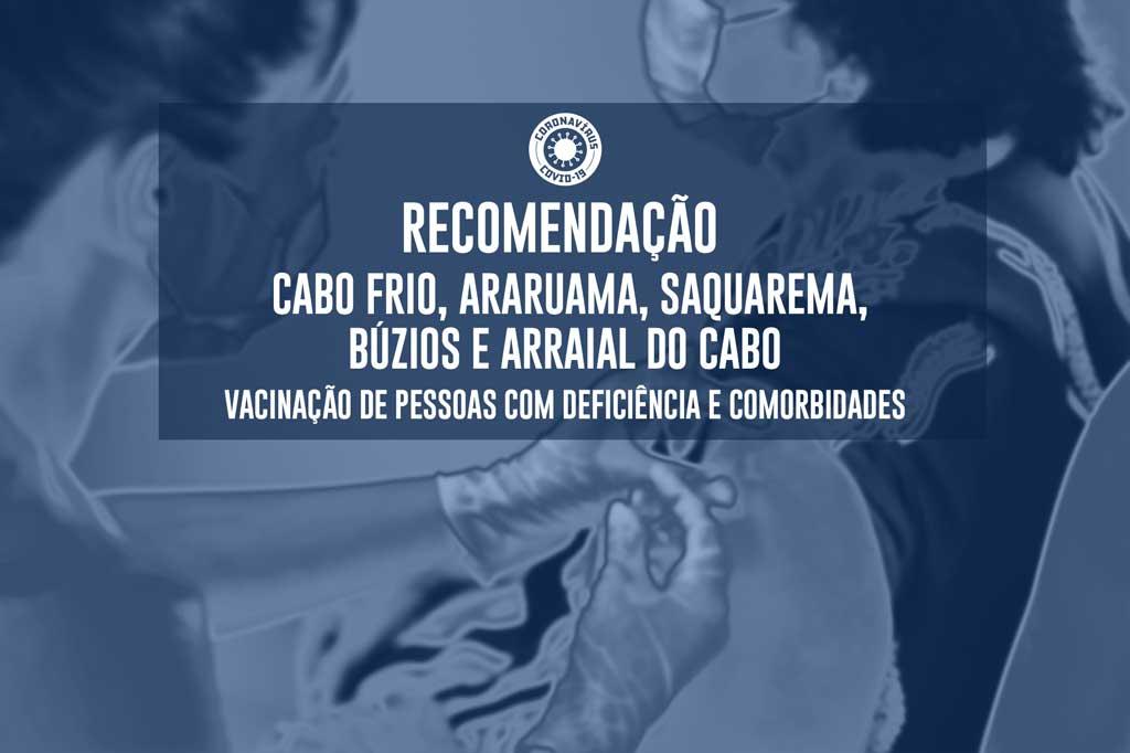 O Ministério Público do Estado do Rio de Janeiro (MPRJ), por meio 3ª Promotoria de Justiça de Tutela Coletiva do Núcleo Cabo Frio, expediu Recomendação aos municípios de Cabo Frio, Araruama, Saquarema, Armação dos Búzios e Arraial do Cabo para que as administrações municipais priorizem os grupos mais vulneráveis no que diz respeito à vacinação contra o novo coronavírus.