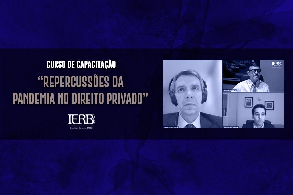 O Ministério Público do Estado do Rio de Janeiro (MPRJ), por meio do Instituto de Educação Roberto Bernardes Barroso (IERBB/MPRJ), realizou, nesta quarta-feira (09/06), a aula inaugural do curso de capacitação “Repercussões da Pandemia no Direito Privado”. O desembargador federal, vice-presidente do Tribunal Regional Federal da 2ª Região e professor titular da UERJ, Guilherme Calmon, foi o responsável pela palestra de abertura do curso, que analisou a legislação que estabeleceu diretrizes jurídicas durante a pandemia, o Regime Jurídico Emergencial e Transitório (RJET). A aula foi transmitida por meio do canal no Youtube do IERBB/MPRJ.