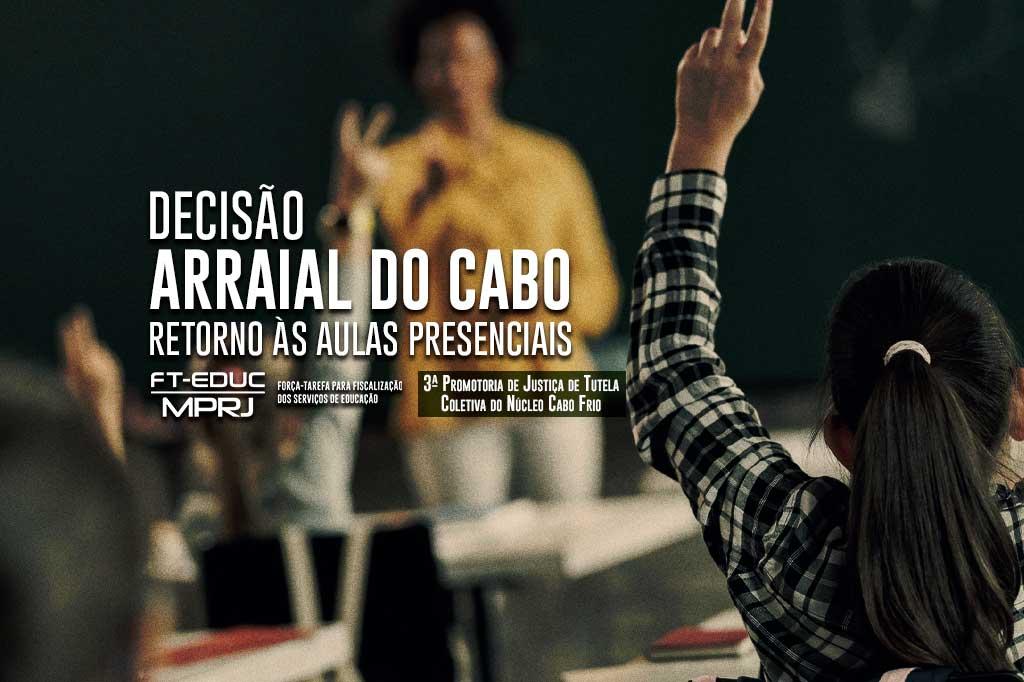 O Ministério Público do Estado do Rio de Janeiro (MPRJ), por meio da Força-Tarefa de Educação (FT-Educação/MPRJ), em auxílio à 3ª Promotoria de Justiça de Tutela Coletiva do Núcleo Cabo Frio, obteve nesta sexta-feira (23/07) decisão favorável determinando que o município de Arraial do Cabo retome as aulas presenciais em um prazo de 15 dias. A decisão, da Vara Única de Arraial do Cabo, atende ao pedido de uma ação civil pública ajuizada na última terça-feira (20/07), a qual demonstrou que, mesmo após a flexibilização da quarentena para o funcionamento de diversas outras atividades, as escolas públicas não foram reabertas.