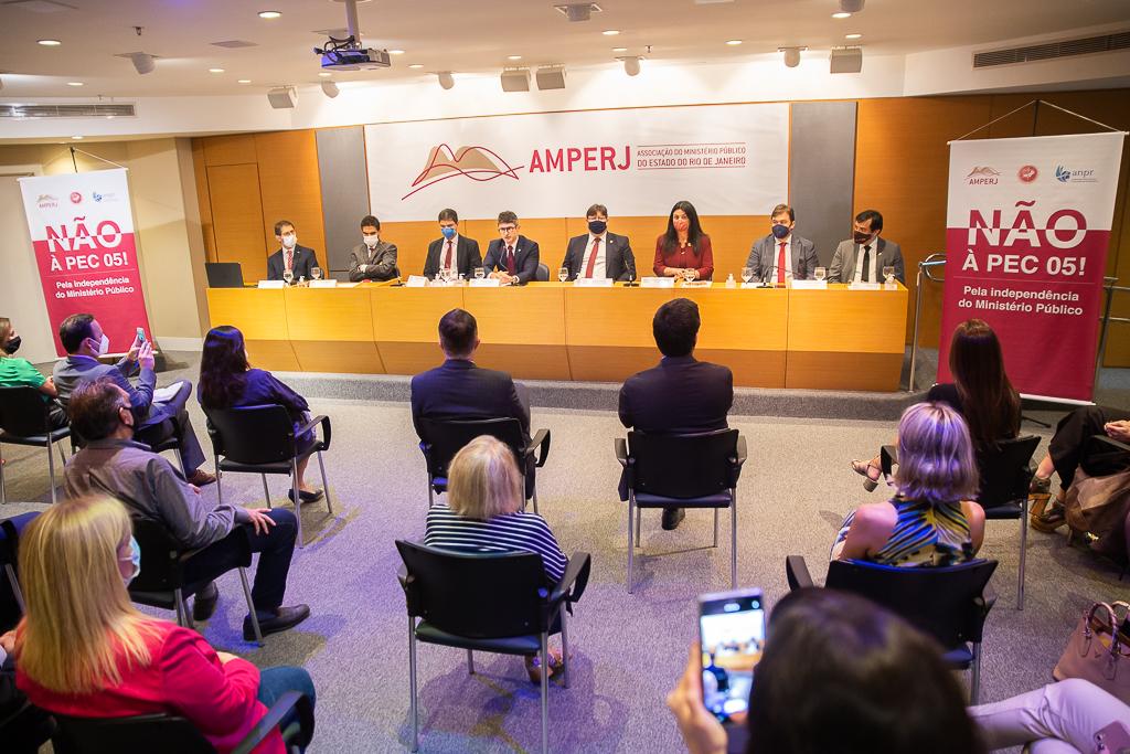 A Procuradoria-Geral de Justiça do Estado do Rio de Janeiro e a Associação do Ministério Público do Estado do Rio de Janeiro (AMPERJ) promoveram um ato público contra a Proposta de Emenda à Constituição nº 5 de 2021 (PEC 5/2021) em tramitação no Congresso Nacional. A PEC altera a composição do Conselho Nacional do Ministério Público (CNMP), abre brechas para a interferência política na instituição, entre outras medidas prejudiciais à atuação do MP em defesa da sociedade. O ato, coordenado pelo Conselho Nacional de Procuradores-Gerais de Justiça (CNPG), pela Associação Nacional dos Membros do Ministério Público (CONAMP) e demais entidades do MP, integrou uma série de manifestações realizadas, nesta quarta-feira (13/10), em todo o país, buscando alertar a sociedade para os prejuízos ao combate à corrupção e à impunidade, caso o texto seja aprovado pelo parlamento. Foram registradas manifestações em pelo menos 19 outros estados.