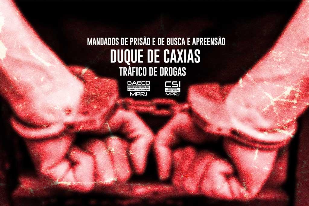 O Ministério Público do Estado do Rio de Janeiro (MPRJ), por meio do Grupo de Atuação Especializada no Combate ao Crime Organizado (GAECO/MPRJ), em conjunto com Polícia Civil, realiza operação nesta sexta-feira (29/10) para cumprir 14 mandados de prisão e 13 mandados de busca e apreensão contra 14 traficantes que atuam em localidades de Duque de Caxias. A ação tem apoio da Coordenadoria de Segurança e Inteligência (CSI/MPRJ).