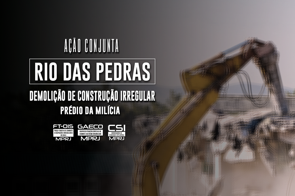 O Ministério Público do Estado do Rio de Janeiro (MPRJ), por meio da Força-Tarefa do Grupo de Atuação Especial no Combate ao Crime Organizado para enfrentamento à ocupação irregular do solo urbano (GAECO/FT-OIS), com o auxílio da Coordenadoria de Segurança e Inteligência (CSI/MPRJ), participa, na manhã desta sexta-feira (26/11), de operação integrada para demolir um prédio em Rio das Pedras, Zona Oeste do Rio.
