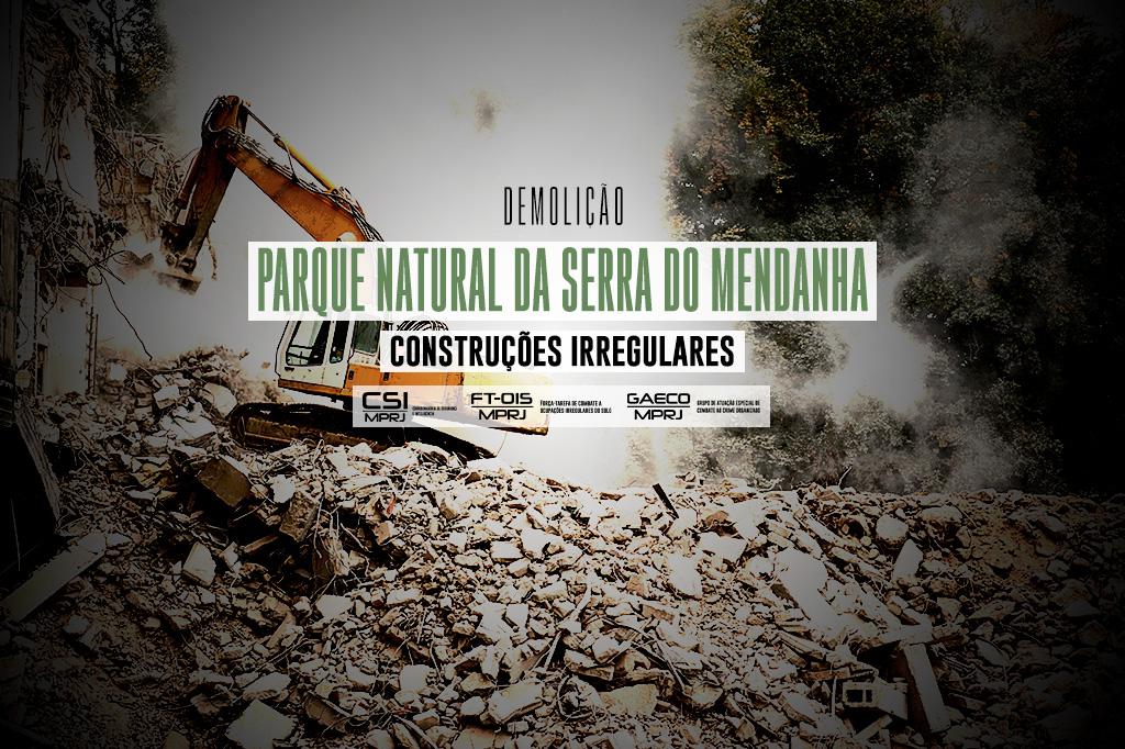 O Ministério Público do Estado do Rio de Janeiro (MPRJ), por meio da Força-Tarefa de Combate à Ocupação Irregular do Solo do GAECO (GAECO/FT-OIS), participa, nesta quarta-feira (29/12), de mais uma operação conjunta para demolir sete construções ilegais localizadas em um loteamento irregular, no interior do Parque Natural Municipal da Serra do Mendanha, em Bangu, na Zona Oeste do Rio de Janeiro. Também participam da operação a Secretaria Municipal do Meio Ambiente (SMAC), o Comando de Policiamento Ambiental da Polícia Militar do Estado do Rio de Janeiro (CPAm) e o 14º BPM.