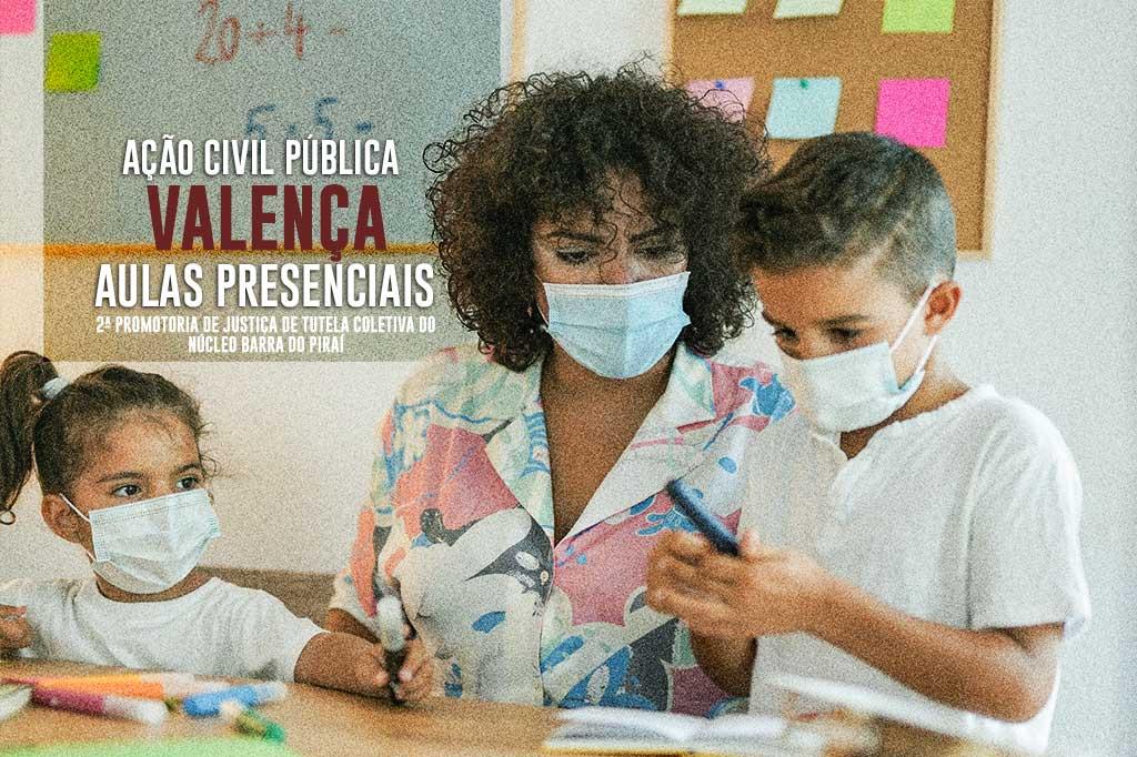 O Ministério Público do Estado do Rio de Janeiro (MPRJ), por meio da 2ª Promotoria de Justiça de Tutela Coletiva do Núcleo Barra do Piraí, ajuizou ação civil pública, com pedido liminar, para que o Município de Valença retome as aulas presenciais em todas as escolas sob sua gestão, mediante a adoção dos protocolos de segurança e sanitários necessários para evitar a transmissão da Covid-19. No último dia 14/02, a Prefeitura havia acatado Recomendação expedida pelo MPRJ nesse sentido. Das 38 escolas municipais, porém, 13 delas (34% do total) não retomaram suas atividades, por alegações diversas do gestor municipal.