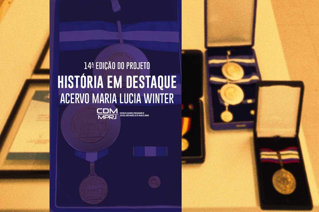 O Ministério Público do Estado do Rio de Janeiro (MPRJ), por meio do Centro de Memória Procurador de Justiça João Marcello de Araújo Júnior (CDM/MPRJ), apresenta, na 14ª edição do projeto “História em Destaque”, a doação do acervo da promotora de Justiça do MPRJ Maria Lucia Winter, que faleceu no dia 31 de dezembro de 2021. Considerando o papel de preservação da memória e divulgação de informações de caráter histórico do Centro de Memória, após sua morte, seu filho, o promotor Vinicius Winter de Souza Lima, doou ao CDM/MPRJ 18 itens documentais e 11 objetos do acervo pessoal de sua mãe, incluindo a Medalha Tiradentes, fotos da Dr. Maria Lucia e certificados de participação em cursos relacionados a sua carreira. Atualmente, a documentação está em processamento técnico arquivístico (higienização, identificação, classificação, ordenação, numeração, descrição, indexação, digitalização e acondicionamento) na sala de reserva técnica do Memorial e irá compor o fundo Maria Lucia Winter, junto aos 16 mil documentos de nosso acervo.