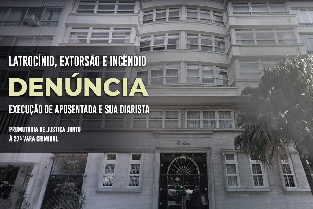O Ministério Público do Estado do Rio de Janeiro (MPRJ), por meio da Promotoria de Justiça Junto à 27ª Vara Criminal, apresentou à Justiça, em 21/06, denúncia contra Jhonatan Correia Damasceno e Willian Oliveira Fonseca, pelos crimes de latrocínio (roubo seguido de morte, por duas vezes), extorsão qualificada e incêndio cometidos contra a aposentada Martha Maria Lopes Pontes e sua diarista, Alice Fernandes da Silva. O caso ocorreu na tarde de 9 de junho de 2022, em apartamento localizado na Avenida Rui Barbosa, no bairro do Flamengo.