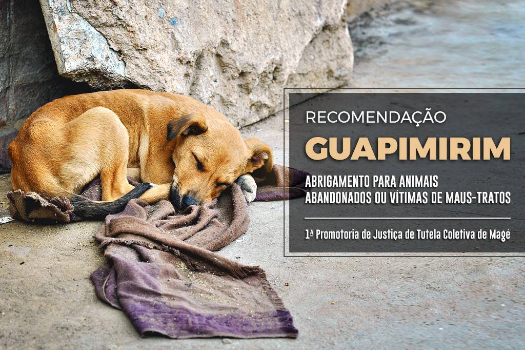 O Ministério Público do Estado do Rio de Janeiro (MPRJ), por meio da 1ª Promotoria de Justiça de Tutela Coletiva de Magé, expediu Recomendação ao município de Guapimirim para que adote uma política pública efetiva no sentido de oferecer locais adequados para abrigamento de animais abandonados ou vítimas de maus-tratos. Também recomendou que o município promova iniciativas de educação ambiental sobre esse tema na cidade, divulgando que é proibido o abandono e a soltura de animais e quais as penas aplicáveis.