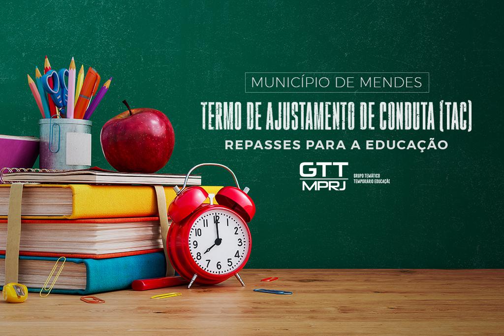 O Ministério Público do Estado do Rio de Janeiro (MPRJ), por meio Grupo Temático Temporário de Educação (GTTE), celebrou, nesta segunda-feira (12/12), Termo de Ajustamento de Conduta (TAC) com o município de Mendes, para que sejam estabelecidas as medidas necessárias para a realização e regularização dos repasses mensais e contínuos de recursos para a área da Educação. Esses repasses devem ser feitos para contas específicas, a serem geridas com exclusividade pelo secretário Municipal de Educação.