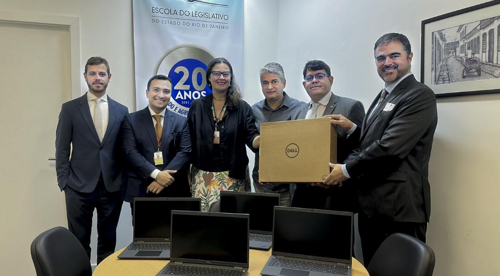 O Ministério Público do Estado do Rio de Janeiro (MPRJ), por meio da 1ª Promotoria de Justiça de Fundações, em esforço conjunto com a Fundação Getúlio Vargas (FGV), entregou, na manhã desta quarta-feira (02/08), laptops novos à Escola Legislativa da ALERJ, na presença da diretora Adriana Valle Mota; do subdiretor da ELERJ, Reginaldo Mendes Leite; e do coordenador Acadêmico Augusto Moutella Nepomuceno. Participaram da cerimônia de entrega os advogados Leonardo Brandão e Carlos Alberto Almeida, da FGV. A iniciativa é fruto de acordo judicial celebrado com a FGV.
