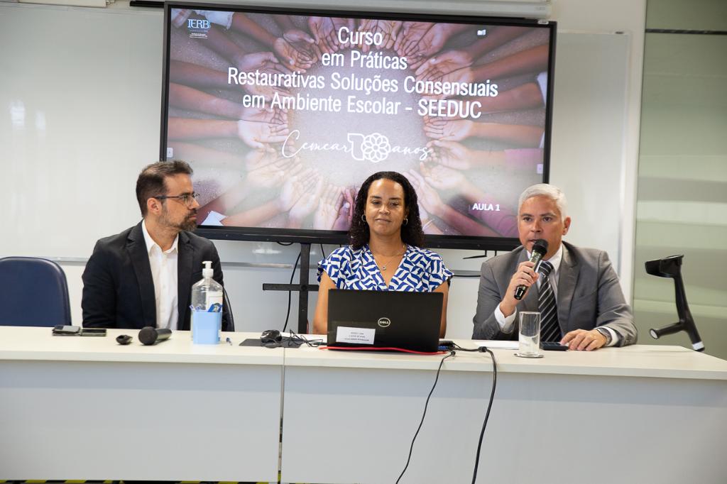 Voltado para profissionais da Secretaria de Estado de Educação (Seeduc-RJ), o curso tem o objetivo de capacitar os profissionais multiplicadores da educação para construção de conhecimento sobre as práticas restaurativas nas unidades escolares. A abertura foi feita pelo vice-diretor do IERBB/MPRJ, o promotor de Justiça Alexandre Couto Joppert. Ele deu boas-vindas aos presentes e parabenizou a idealização do curso para a Secretaria de Estado de Educação. "O tema é absolutamente importante, não só para o Ministério Público, como para toda a sociedade, na busca, dentro das práticas restaurativas de soluções consensuais em ambiente escolar", disse o vice-diretor.