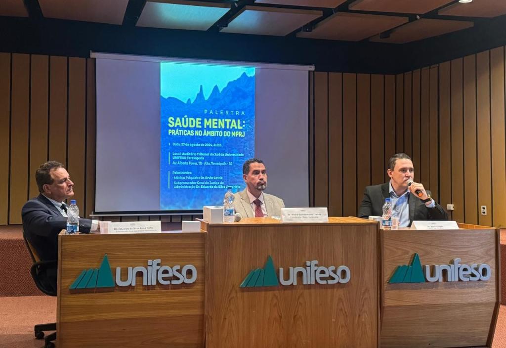 O Ministério Público do Estado do Rio de Janeiro (MPRJ), por meio do Centro Regional de Apoio Administrativo Institucional de Teresópolis (CRAAI Teresópolis), promoveu, nesta terça-feira (27/08), às 11h, uma palestra sobre saúde mental no auditório do Centro Universitário Serra dos Órgãos (UNIFESO), em Teresópolis. O evento “Saúde Mental: Práticas no Âmbito do MPRJ” contou com a presença do subprocurador-geral de Justiça de Administração, Eduardo Lima Neto, do coordenador de Saúde Mental do MPRJ, o psiquiatra Ervin Cotrik, e do coordenador do CRAAI local, promotor de Justiça André Guilherme Freitas.