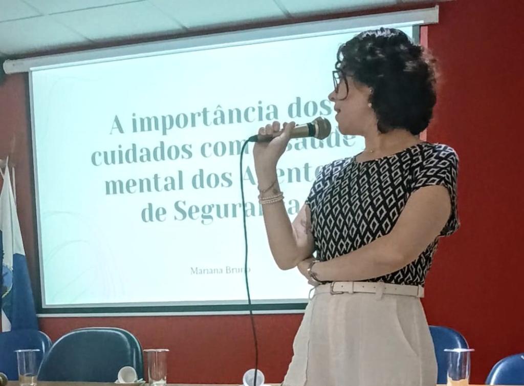 A palestrante destacou a importância de se olhar para a saúde mental dos agentes da área de segurança pública, salientando que os desafios psicológicos e emocionais que enfrentam são os maiores responsáveis pelo adoecimento mental. Foi destacado, ainda, o alarmante número de suicídios que ocorrem entre os profissionais da segurança pública de todo o país, muitas vezes fruto do desgaste psicológico no exercício de suas funções.