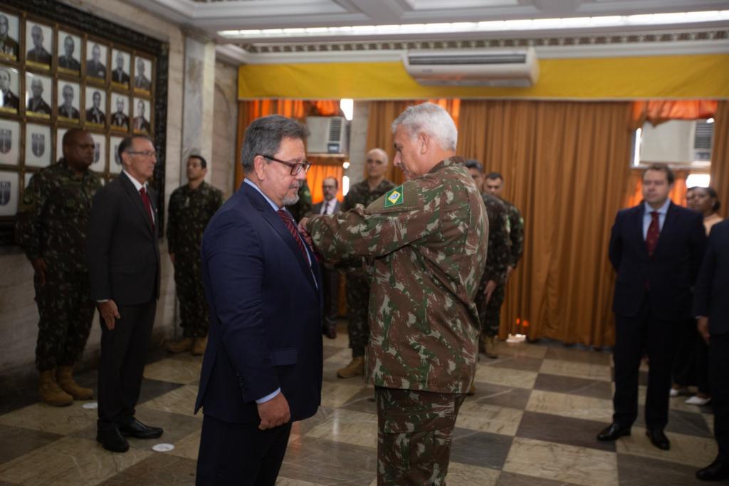 O procurador-geral de Justiça, Antonio José Campos Moreira, recebeu, nesta segunda-feira (24/03), a Medalha do Pacificador do Exército das mãos do comandante militar do Leste, general Kleber Nunes de Vasconcellos. A cerimônia, realizada no Comando Militar do Leste, contou com as presenças do chefe de gabinete da Procuradoria-Geral de Justiça, Guilherme Schueler, do ouvidor do Ministério Público do Estado do Rio de Janeiro (MPRJ), David Faria, e de oficiais do Exército.