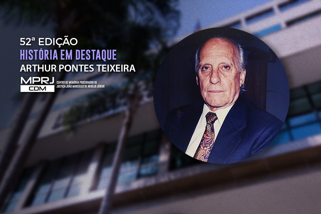 O Centro de Memória Procurador de Justiça João Marcelo de Araújo Júnior (CDM/MPRJ) homenageia, na 52ª edição do projeto História em Destaque, a trajetória institucional do procurador de Justiça aposentado Arthur Pontes Teixeira, que iniciou sua trajetória no Ministério Público do antigo Estado do Rio de Janeiro em 1965, como Membro do Ministério Público Substituto. Antes de ingressar na instituição, Arthur, que nasceu no Rio de Janeiro em 12/07/1926, havia iniciado sua trajetória profissional no serviço militar, em 1943.