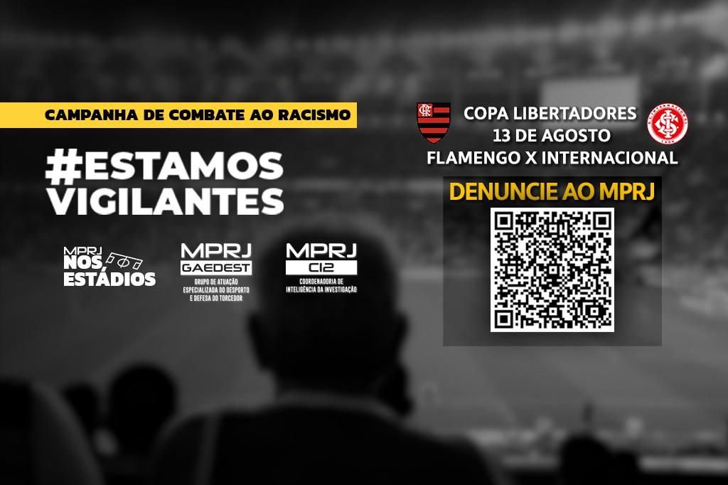 Com o objetivo de prevenir e combater atos de racismo e xenofobia nas competições internacionais, o Ministério Público do Estado do Rio de Janeiro (MPRJ), em parceria com Flamengo, Botafogo e Fluminense, retorna com a ação #EstamosVigilantes nas fases finais das Copas Libertadores e Sul-Americana. Promotores de Justiça do Grupo de Atuação Especializada do Desporto e Defesa do Torcedor (GAEDEST/MPRJ) estarão in loco no Maracanã e Nilton Santos, no monitoramento e atuação em eventuais flagrantes.