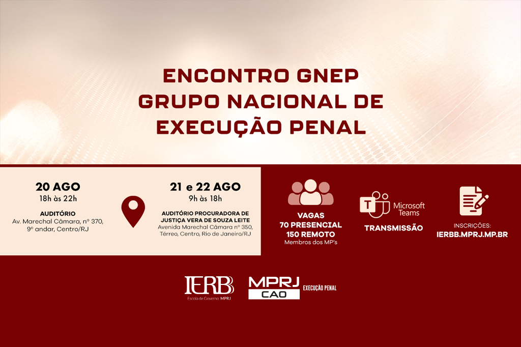 O Ministério Público do Estado do Rio de Janeiro (MPRJ) será sede, de quarta-feira (20/08) a sexta-feira (22/08), do Encontro do Grupo Nacional de Execução Penal (GNEP/CNPG), que reunirá autoridades do Poder Executivo Federal e Estadual, do Judiciário, do Ministério Público e especialistas de todo o país para discutir políticas penais, segurança pública e execução penal.