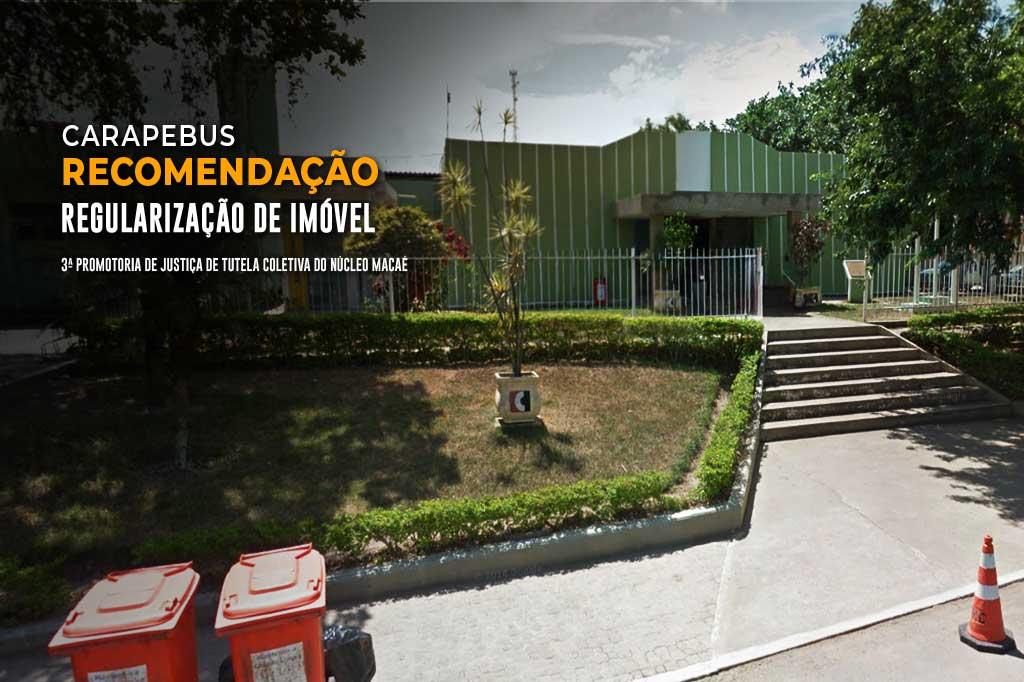 O Ministério Público do Estado do Rio de Janeiro (MPRJ), por meio da 3ª Promotoria de Justiça de Tutela Coletiva de Macaé, expediu Recomendação ao prefeito de Carapebus, Bernard Tavares Dídimo, para que adote medidas imediatas destinadas à regularização integral do imóvel que abriga a sede administrativa do município, atualmente em situação irregular por ausência de alvará de funcionamento, projeto arquitetônico aprovado e licenciamento junto aos órgãos competentes.