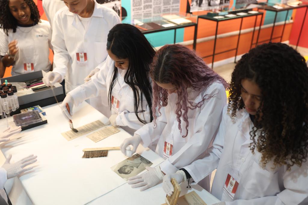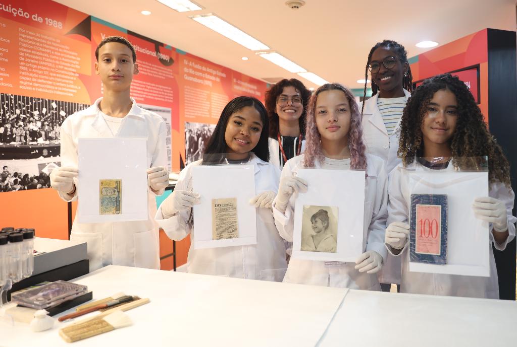 Em outro momento, a estagiária de Arquivologia, Lucimara de Paulo, e Evellyn Dayana, orientaram uma atividade prática em que quatro alunos simularam as etapas do trabalho de preservação documental, como o recebimento, a higienização e o acondicionamento de documentos históricos, processo semelhante ao realizado na Reserva Técnica do Memorial.