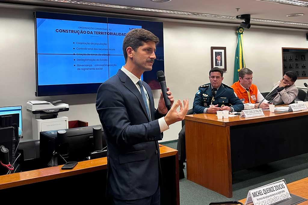 Durante a audiência, o assistente do GAESP/MPRJ, promotor de Justiça Michel Zoucas, abordou aspectos relativos às organizações criminosas em atuação no território fluminense, analisando a dinâmica do controle de territorialidade e suas divisões, como facções, milícias, contraventores e grupos atuantes dentro dos presídios. Zoucas citou ainda os ciclos político, como estratégia de enfraquecimento do Estado, e econômico, baseado na geração de receita ilícita, lavagem de dinheiro e inserção em empresas formais, desenvolvidos por esses grupos. O combate à máfia italiana foi citado como um modelo a ser seguido.