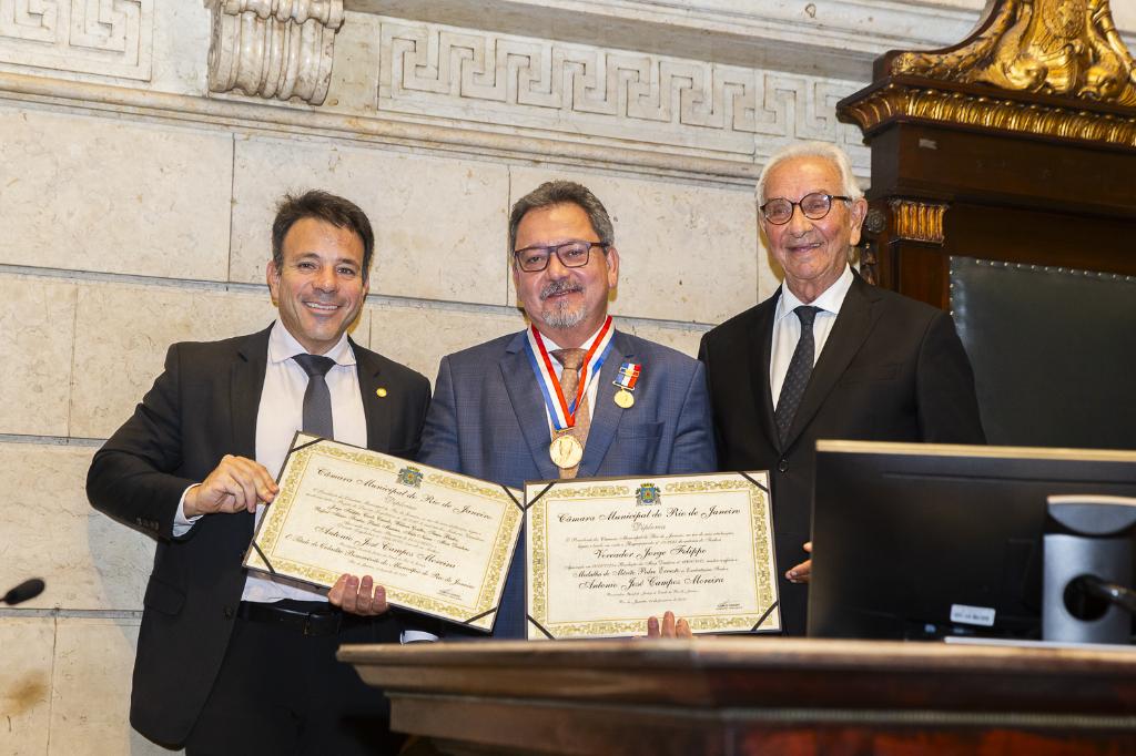 O procurador-geral de Justiça, Antonio José Campos Moreira, recebeu, nesta terça-feira (04/11), da Câmara Municipal do Rio de Janeiro, a Medalha do Mérito Pedro Ernesto, a mais alta honraria concedida pelo Legislativo carioca, e o título de Cidadão Benemérito da Cidade do Rio de Janeiro. A comenda foi entregue pelo vereador Jorge Felippe, e o título, pelo presidente da Casa, Carlo Caiado.