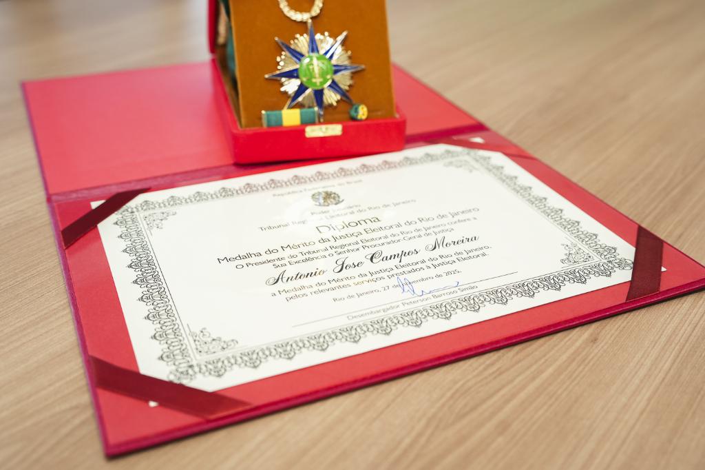 O procurador-geral de Justiça, Antonio José Campos Moreira, recebeu, nesta segunda-feira (01/12), em seu gabinete, a Medalha do Mérito Eleitoral, entregue pela assessora institucional da Secretaria-Geral da Presidência do Tribunal Regional Eleitoral do Rio de Janeiro (TRE-RJ), Annita Saldanha. A honraria, destinada a reconhecer personalidades que prestaram relevantes serviços à Justiça Eleitoral e à cultura jurídica, foi concedida em cerimônia realizada no dia 27/11, no Grande Hall do Palácio da Democracia, sede do TRE-RJ, no Centro do Rio. Na ocasião, o PGJ não pôde comparecer devido a compromissos institucionais no Supremo Tribunal Federal (STF).