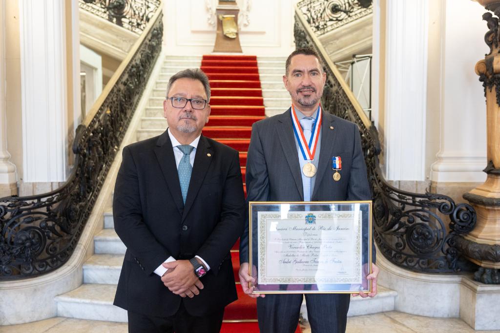 O promotor de Justiça André Guilherme Freitas, assessor da Subprocuradoria-Geral de Justiça de Administração e titular da 3ª Promotoria de Justiça de Execução Penal da Capital, recebeu nesta quarta-feira (08/04), em cerimônia realizada na Câmara Municipal do Rio de Janeiro, o Conjunto de Medalhas de Mérito Pedro Ernesto, mais alta honraria concedida pelo Poder Legislativo carioca. O procurador-geral de Justiça, Antonio José Campos Moreira, prestigiou o evento e participou da mesa da cerimônia, presidida pelo vereador Chagas Bola, autor da proposta de concessão da comenda.
