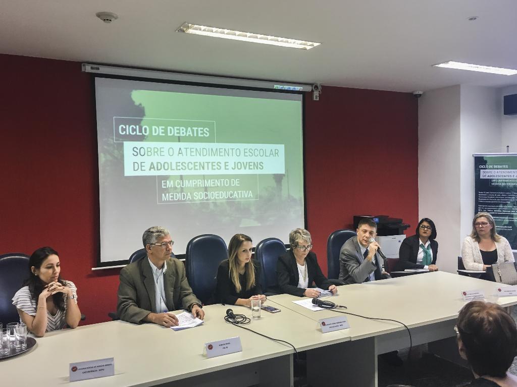 No formato de escutas públicas, os encontros buscam debater os problemas que afetam a oferta do atendimento escolar aos adolescentes em cumprimento de medidas socioeducativas, tanto em meio fechado quanto em meio aberto. O público alvo é composto por pais, alunos, profissionais das Secretarias Estaduais e Municipais de Educação e Assistência Social, integrantes dos Conselhos Municipais de Educação, dos Conselhos Tutelares, dos Conselhos Escolares, das representações sociais e estudantis, do Ministério Público e demais carreiras da área jurídica.