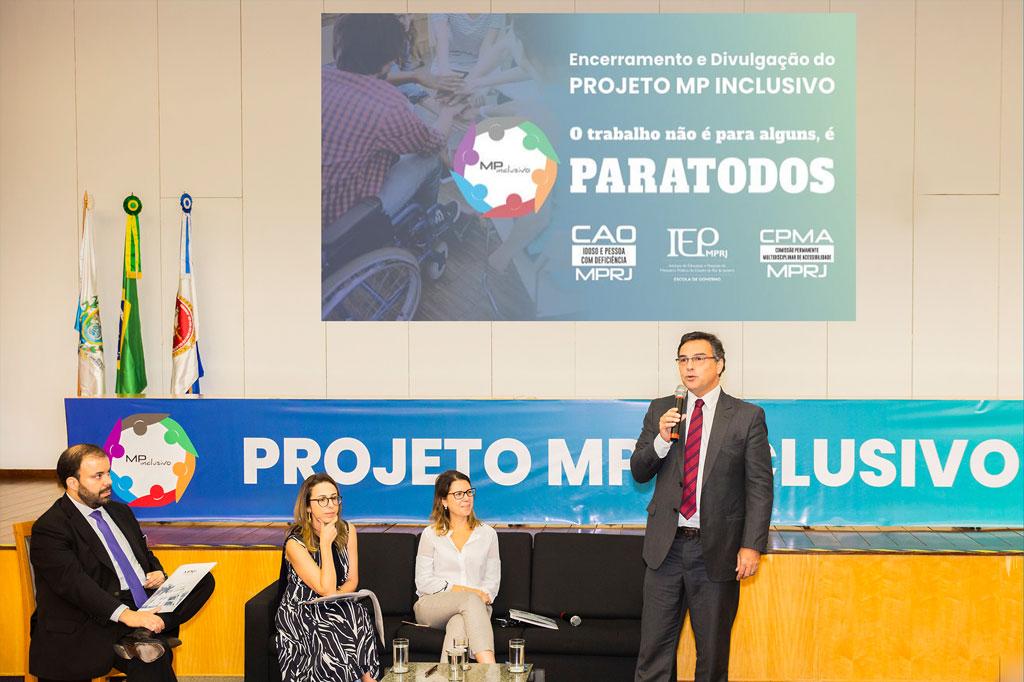 O Ministério Público do Estado do Rio de Janeiro (MPRJ) realizou, na tarde de segunda-feira (29/04), o evento ‘Encerramento e Divulgação do Projeto MP Inclusivo - O trabalho não é para alguns, é Paratodos’. Realizado pelo Instituto de Educação e Pesquisa (IEP/MPRJ), pelo Centro de Apoio Operacional das Promotorias de Justiça de Proteção ao Idoso e à Pessoa com Deficiência (CAO Idoso/MPRJ) e pela Comissão Permanente Multidisciplinar de Acessibilidade (CPMA/MPRJ), o evento lotou o auditório do edifício-sede da instituição.