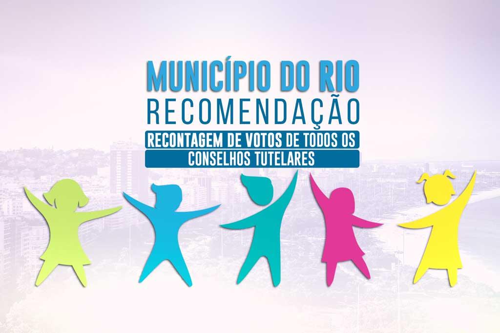 O Ministério Público do Estado do Rio de Janeiro (MPRJ), por meio da 1ª Promotoria de Justiça de Tutela Coletiva da Infância e Juventude da Capital, emitiu recomendação ao Secretário Municipal de Assistência Social e Direitos Humanos (SMASDH) e ao Conselho Municipal de Direitos da Criança e Adolescente (CMDCA) para que promovam a recontagem de votos de todos os Conselhos Tutelares no município do Rio. O MPRJ emitiu ainda uma segunda recomendação sugerindo dar publicidade à recontagem.