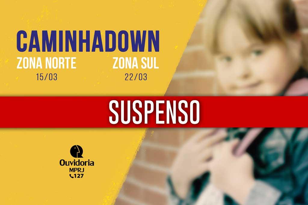 O Ministério Público do Estado do Rio de Janeiro (MPRJ), por meio da Ouvidoria Itinerante/MPRJ, informa que, seguindo as recomendações de autoridades médicas para minimizar os riscos de transmissão do coronavírus (COVID-19), os eventos CaminhaDown nas zonas Norte e Sul da capital fluminense, marcados para os próximos dias 15/03 e 22/03, foram suspensos por tempo indeterminado. O evento do dia 15/03 estava marcado para a Praça Aquidauana, em Vicente de Carvalho, em frente ao Carioca Shopping. Já o evento do dia 22/03, estava previsto para acontecer no Posto 8 da Orla de Ipanema, em frente ao Hotel Fasano.