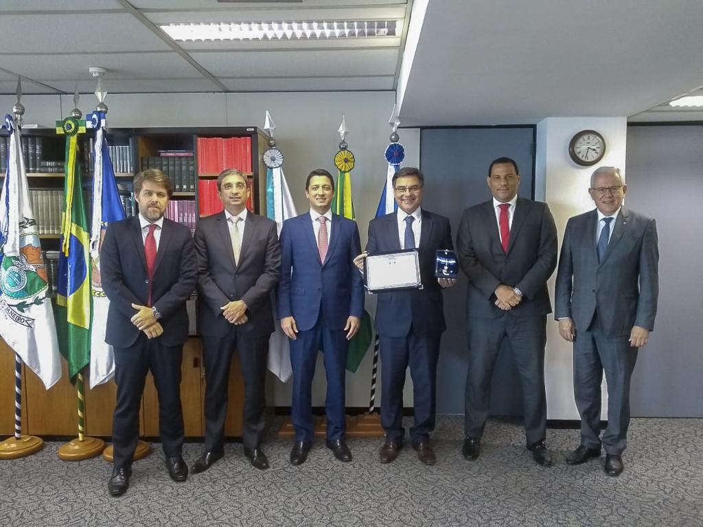 O procurador-geral de Justiça, Eduardo Gussem, recebeu em seu gabinete, nesta quinta-feira (24/09), das mãos do novo procurador-geral do Estado, Bruno Dubeux, a Medalha do Mérito da Procuradoria-Geral do Estado do Rio (PGE), honraria concedida pelo Conselho Superior da PGE por serviços prestados ao Estado do Rio. A honraria foi de iniciativa do Procurador-Geral Rodrigo Zabão, que ocupou a chefia da PGE-RJ no ano de 2018. Também participaram do encontro o subprocurador-geral de Justiça de Relações Institucionais e Defesa de Prerrogativas, Marfan Martins Vieira, os subprocuradores-gerais do Estado, Flávio Willeman e Rafael Rollim, e o procurador do Estado Cláudio Pieruccetti, chefe de gabinete da PGE.