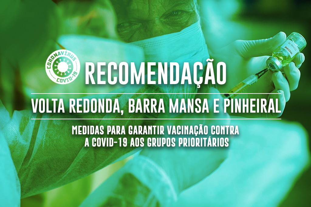 O Ministério Público do Estado do Rio de Janeiro (MPRJ), por meio da 3ª Promotoria de Justiça de Tutela Coletiva do Núcleo de Volta Redonda, expediu, na segunda-feira (18/01). Recomendação aos municípios de Volta Redonda, Barra Mansa e Pinheiral, representados pelos respectivos prefeitos, Antônio Francisco Neto, Rodrigo Drable e Ednardo Barbosa, para que sejam adotadas todas as medidas previstas no Plano Nacional de Operacionalização da Vacinação contra a covid-19, no Informe Técnico que preconiza sobre a campanha nacional de vacinação contra a covid-19, bem como para o integral cumprimento à Portaria GM/MS Nº 69, de 14 de janeiro de 2021 e demais legislações pertinentes.